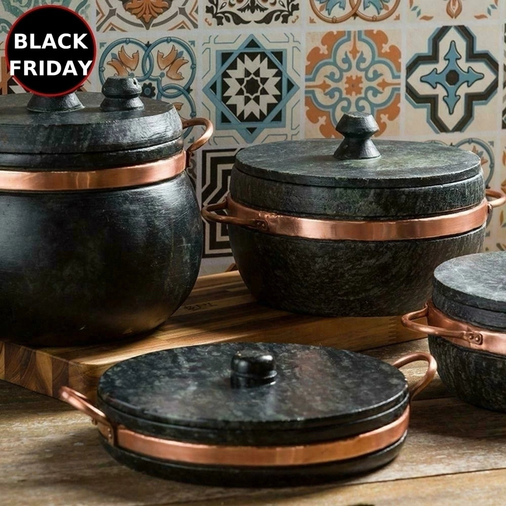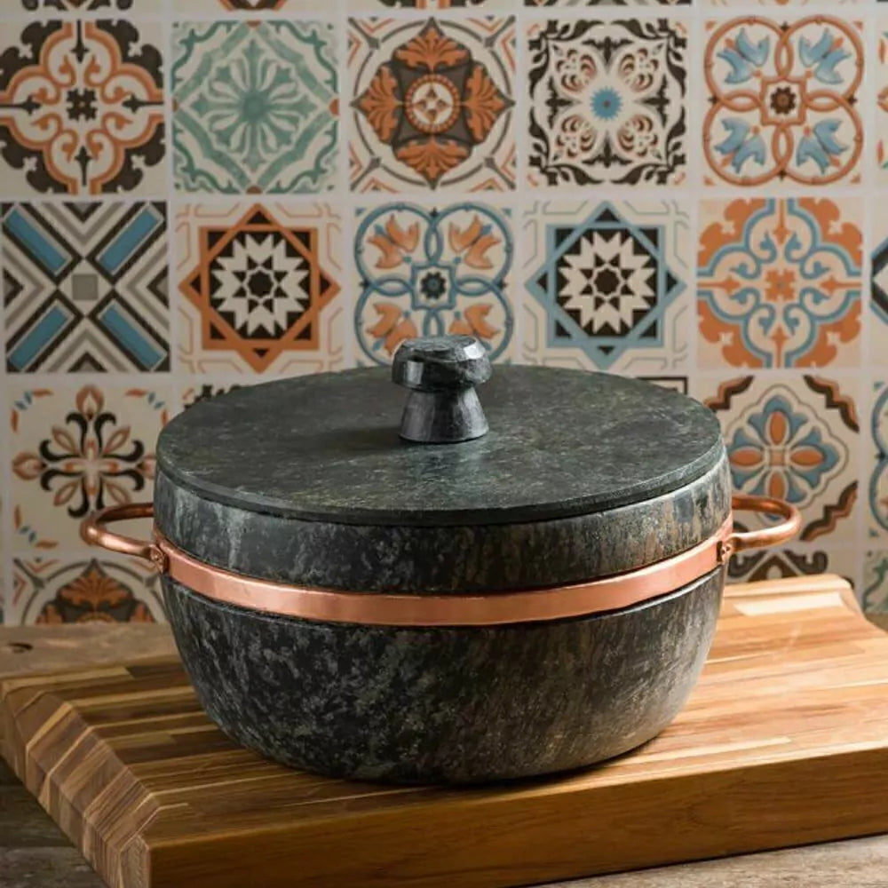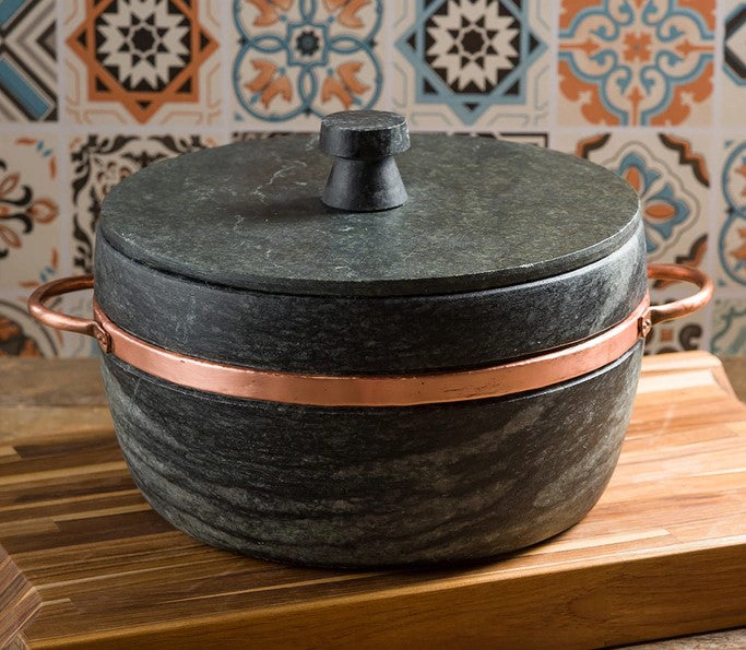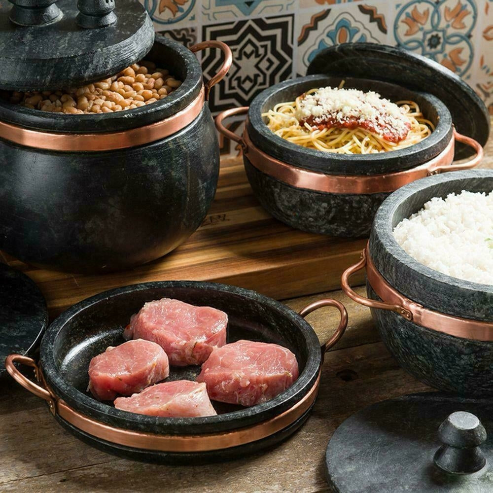 - Material: Pedra sabão e cobre (alças).