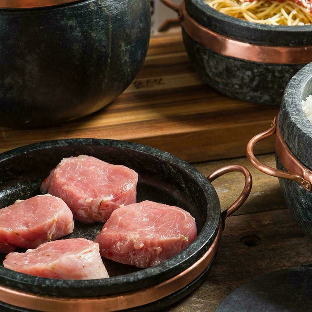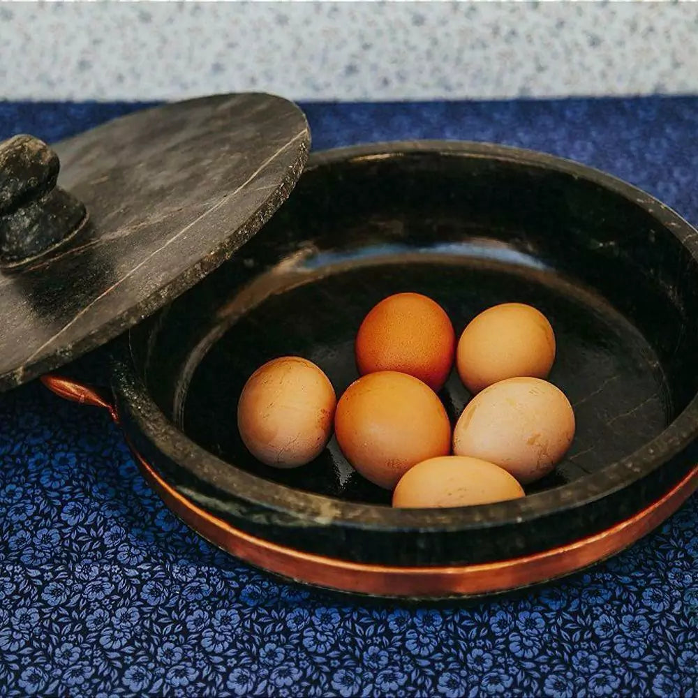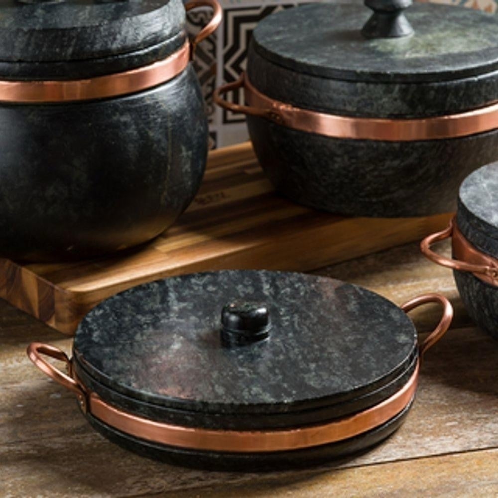 - Material: Pedra sabão e cobre (alças).